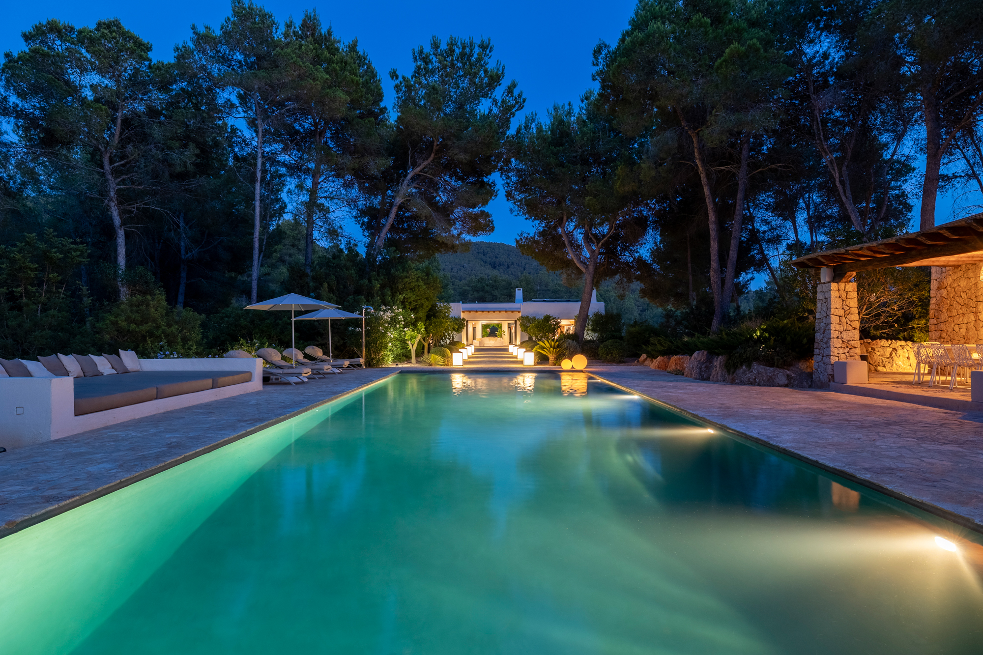 High on a hill overlooking the beautiful rolling countryside of northern Ibiza, this luxurious villa enjoys a truly special location. It blends traditional Ibizan style with modern design, creating a light and airy feel with skylights. The peaceful gardens, filled with the scent of pine trees, surround the villa. The highlight is the stunning pool area, nestled among the trees, where you can relax and soak up the sun in your own private piece of paradise.